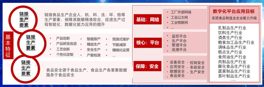 数字化食品生产企业界定:基于“互联网+”发展概念,以云计算服务、大数据计算、5G通讯技术、区块链应用技术为代表的先进信息技术与食品生产业务深度融合形成的新业务平台和新运营模式,本质是用“数据+模型”的方式方法为食品生产企业提供辅助业务实操的应用服务,以管理中心、生产制造中心、质控保障中心、经营销售中心、食品安全中心的数据互联互通为基础,通过对人机料法环检六维数据的全面量化建模、快速计算处理和实时传输交换,实现数据控制、生产优化和生产组织方式变革的先进数字制造型企业。